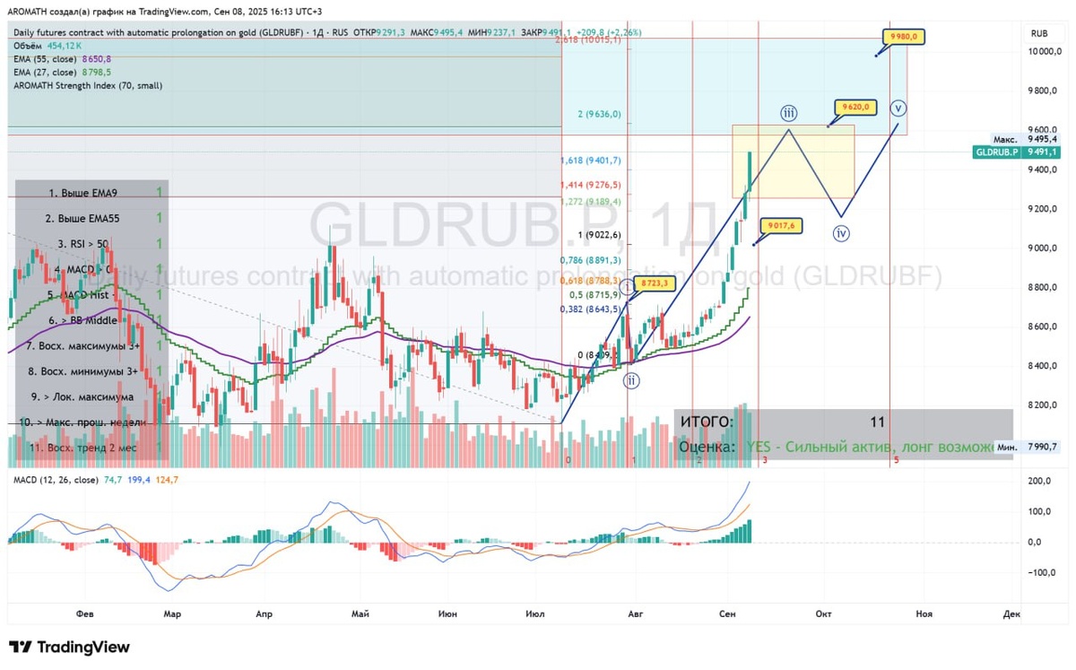 В ответ на пост 💰 Идея от августа месяца - про золото писал очень много. Но что толку в вашей аналитике писать, делать надо. Золото войдет в эту осень на максимальном хайпе. 1 сентября напоминал про золотую осень, как мог - https://dzen.ru/media/tradervip/nachinaem-zolotuiu-osen-udarno-vo-vseh-smyslah-po-trendu-68b542a702158b7c08d289fc. Сильно выше 3800+ долларов золото Gold по иностранным котировкам я в этой волне не вижу пока что, это и так будет уже немыслимая экстра-цель 3780 от Aromath. Круглую цифру 4000 не должны бы пробить. Если пробьем вдруг, а банан - это будет просто банан в данном случае, если на снижении ставки ФРС повезут сильно дальше ( а такое возможно) - проще будет перезайти еще раз с новыми экстра-целями по тренду. Золото в рублях #Gldrubf #Gldrub_tom отлично едет в мягком вагоне по плану Aromath при помощи рычага от валюты к рублю - с момента нашего входа от 21 июля в Клубе по 8400 прибавляем уверенно +13% за 49 дней. Напоминал раз десять за пару недель, что э