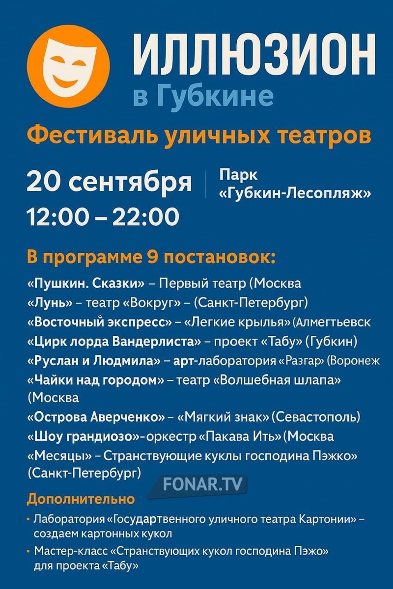 🎭 «ИЛЛЮЗИОН» в Губкине (12+) — 20 сентября город в третий раз примет у себя фестиваль уличных театров. Раскрываем подробности творческого события, которой пройдёт в парке «Губкин-Лесопляж» с 12:00 до 22:00. 🔹 В программе 9 постановок: «Пушкин. Сказки» — Первый театр (Москва) «Лунь» — театр «Вокруг» (Санкт-Петербург) «Восточный экспресс» — «Лёгкие крылья» (Альметьевск) «Цирк лорда Вандерлиста» — проект «Табу» (Губкин) «Руслан и Людмила» — арт-лаборатория «Разгар» (Воронеж) «Чайки над городом» — театр «Волшебная шляпа» (Москва) «Острова Аверченко» — «Мягкий знак» (Севастополь) «Шоу грандиозо» — оркестр «Пакава Ить» (Москва) «Месяцы» — «Странствующие куклы господина Пэжо» (Санкт-Петербург) ✨ Дополнительно: Лаборатория «Государственного уличного театра Картонии» — создаём картонных кукол Мастер-класс «Странствующих кукол господина Пэжо» для проекта «Табу» 🔦Подпишись на «Фонарь». У слов появляется сила, если вы с нами. Присоединяйтесь!