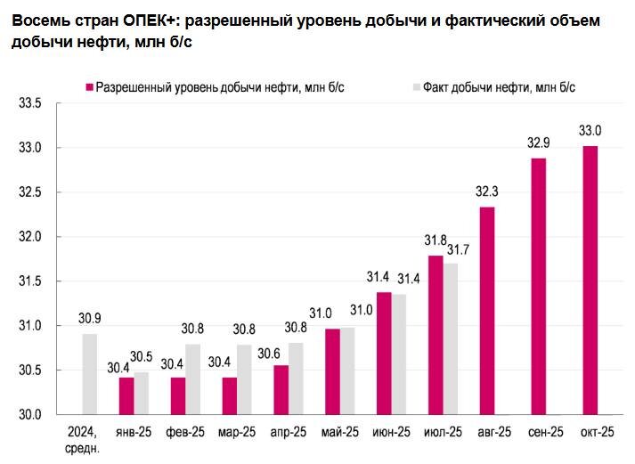 ‼️Brent может упасть к $60 за баррель к концу года. Причины вижу две: профицит + спад сезонного спроса. 🤔 7 сентября страны ОПЕК+ неожиданно решили нарастить добычу: плюс 137 тыс. б/с уже в октябре. Это первый шаг к возврату 1,65 млн б/с, которые они убрали с рынка еще весной 2023. Рынок ждал паузы, но альянс выбрал другое - вернуть себе долю рынка, даже ценой снижения котировок. 📌 Факт: пока добыча держится около 30,9 млн б/с (как и раньше). Но с июля в рынок пошли дополнительные объемы, и именно они могут продавить цену вниз. 💭 Почему я жду снижения к зиме: предложение растет быстрее спроса, сезон пикового потребления заканчивается, а экономики США и Европы явно замедляются. Всё это - идеальная почва для $60 по Brent. Для трейдера это значит одно - лонги в нефти становятся рискованными, а вот шорты по Brent или ставку на ослабление нефтяных акций можно держать в фокусе.