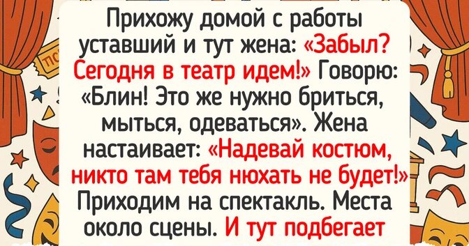 Прихожу с работы выжатый, как лимон. Жена: «Забыл? Сегодня театр!» Я: «Блин, надо бриться, одеваться...» Она: «Надевай костюм, никто тебя нюхать не будет!» Приходим. Места у сцены. И тут выбегает собака — один из актёров. Подбегает ко мне и начинает… тщательно обнюхивать. Я смотрю на жену. Она смеётся. Я молча думаю: «Она была права. Меня действительно никто не будет нюхать. Только одна собака».