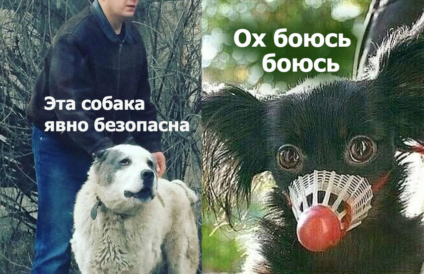 Регулярно вижу заметки на эту тему и комментарии в духе "Собаку в наморднике люди боятся больше, ведь если на ней намордник, значит она агрессивная. Поэтому лучше водить ее без намордника". Не думаю, что собачники, которые говорят это, сами в это верят, но все же предлагаю попробовать разобраться. Лично я считаю, что образ опасной/неопасной собаки у прохожих формируется во-первых, с опорой на ее размеры. Если навстречу движется шпиц, йорк или еще что-то такое же небольшое, то прохожим в целом все равно, есть на нем намордник или нет. И я думаю, что так считает большинство людей. Возможно, некоторые, увидев в наморднике пёсика чуть толще поводка, и правда на миг подумают, что, наверное, без намордника он стремится всем сделать "кусь". Но, согласитесь, вероятный "кусь" от тойчика раз в 100 менее страшен, чем от кавказской овчарки, ротвейлера или иного пёсика свыше 40 кг весом. То же самое относится к средних размеров зубастым породам с увеличенной лицевой частью. И тот факт, что такая