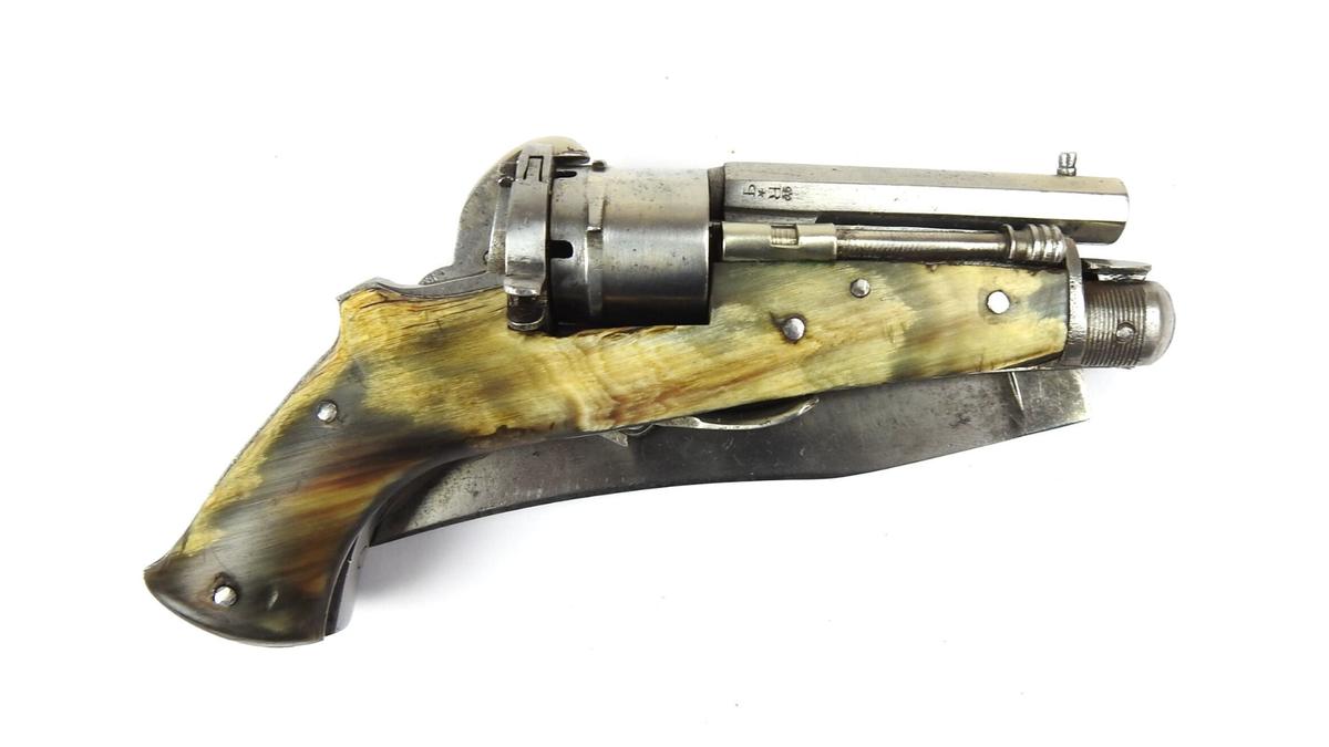 В принципе, сама идея приделать что-то компактное и стреляющее к чему-то компактному и режущему в Старом Свете была не то что бы экзотикой, а скорее наоборот - вот буквально сегодня наткнулся на такую кремневую прелесть в формате целого столового набора: Да и вообще о "ножевилкопистолетах" уже писалось: Однако герой сегодняшней статьи, пусть и остался малоизвестным, все-таки отличился. Итак, 14 сентября 1887 года месье Жак Сиго регистрирует свое личное клеймо как мастер из городка Бельфор, что в округе Тьер - а места эти давно известны именно ножеделием, а не огнестрельным оружием. Что ж, именно всевозможные ножи месье и начал делать - но, когда и куча твоих соседей занята тем же самым, проблематично быстро заработать. Что ж, Сиго пошел странным путем, но выделиться точно смог: на рубеже веков в каталогах Франции и Бельгии появилось вот это чудо (как минимум, в каталоге Jules Pire & Co от 1899 года это числится как "великая новинка"). Хотя на то время уже правили бал патроны центрально
