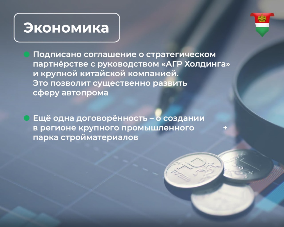 🟢Владислав Шапша в Китае: итоги В начале новой недели предлагаем вспомнить, как прошла рабочая поездка губернатора в КНР. За несколько дней были подписаны новые соглашения в сферах автопрома и производства стройматериалов. Отношения с Китаем развиваются не только в экономическом направлении. Укрепляются связи в образовательной и культурной сферах. Международная политика губернатора не раз отмечалась на федеральном уровне. Не зря глава МИД РФ Сергей Лавров однажды сказал: «Я вижу залог успеха внешней политики страны в таких областях, как Калужская» Итогами визита главы региона в Китай делимся в карточках. ❤️ Подписывайтесь на официальный канал Правительства в MAX