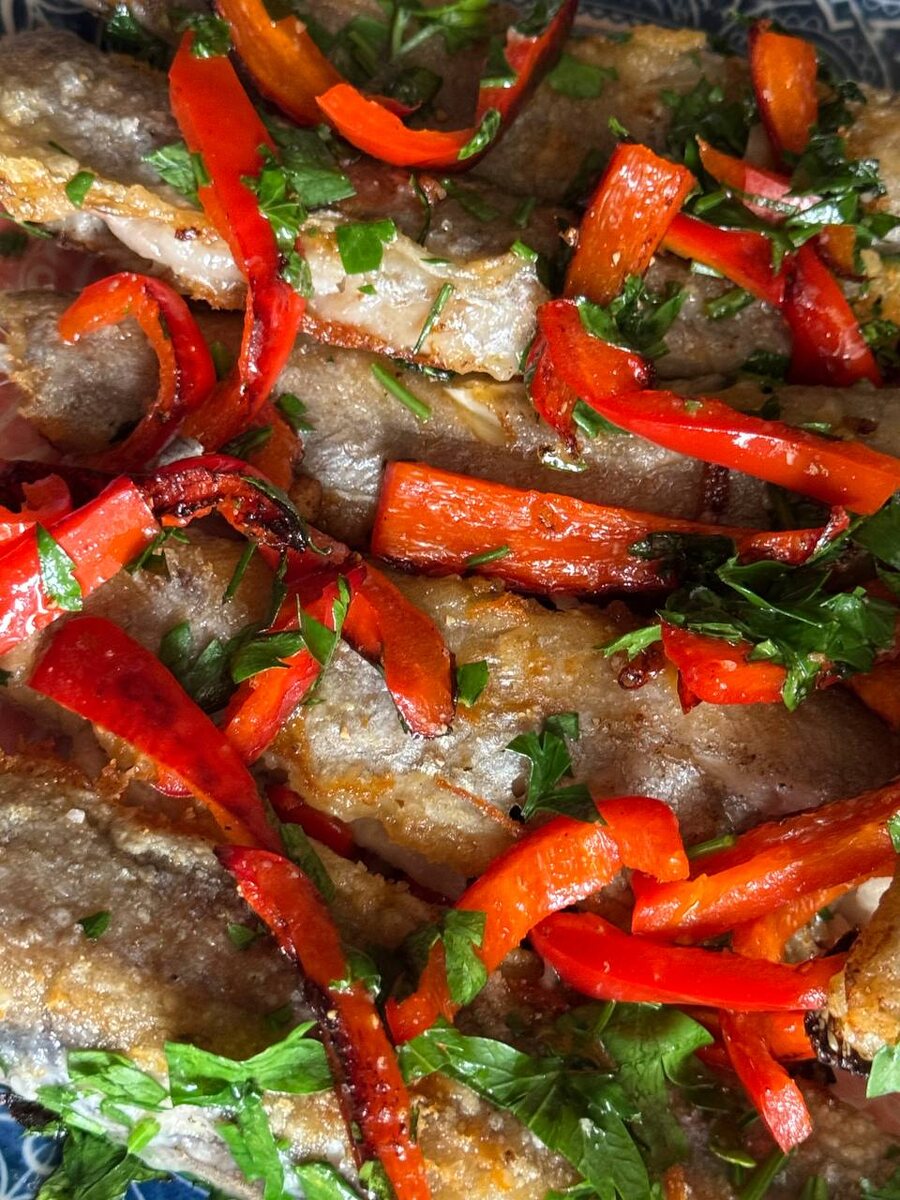 🔠🔠🔠🔠🔠🔠🔠. Путассу обжаренная в рисовой муке с красными перцами. Кто не любит Путассу? А между тем это кладезь микроэлементов и витамина А. Стоит - недорого Готовится - просто Вкус - отличный. КБЖУ - 100 грамм 82 кКал; 18,5 гр белка! 0,9 гр жиров и 0 углеводов! Ингредиенты: 1️⃣ Путассу с/м - 0,5 кг 2️⃣ Мука рисовая (клейкая) - 2 ст.л 3️⃣ Масло растительное для обжарки - 1 ст.л 4️⃣ Красный болгарский перец - 1 шт 5️⃣ Зелень петрушки Приготовление: 1. Рыбку размораживаем. Чем мягче, тем лучше, например в холодильнике. Моем, голову и хвост - долой! 2. Присаливаем и обваляв в муке обжариваем до золотистого хруста на разогретой сковороде в небольшом количестве масла, на огне выше среднего. 3. Когда, примерно через 7 минут одна сторона будет готова, переворачиваем и добавляем к рыбе порезанный не длинными полосками болгарский перец. Пару раз его перемешиваем. За пару минут до конца добавляем петрушку и перемешиваем 4. Выкладываем всё на тарелку. Ангела за трапезой! Ваш ПП - Правос