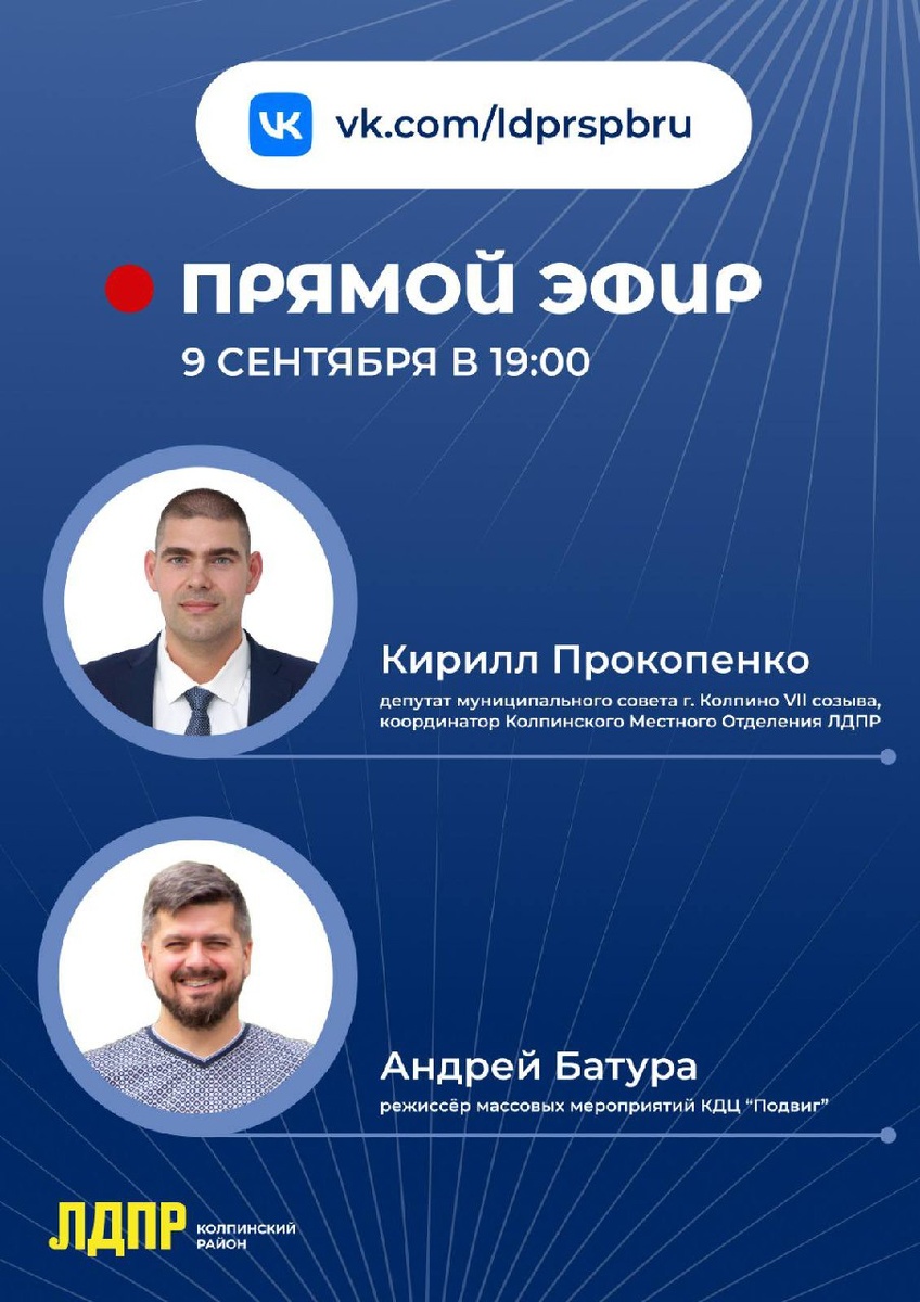 📣 Прямой эфир 9 сентября в 19:00 координатор Колпинского Местного Отделения ЛДПР Кирилл Прокопенко проведёт прямой эфир с приглашённым гостем - Андреем Батурой, режиссёром КДЦ «Подвиг». Тема эфира: роль культурных проектов в жизни города и их значение для развития общества. Присоединяйтесь! У вас будет возможность задать вопросы о роли культуры в развитии города и поделиться своим мнением. 🔗 Мы ВКонтакте 🖥 Сайт ЛДПР | Санкт-Петербург
