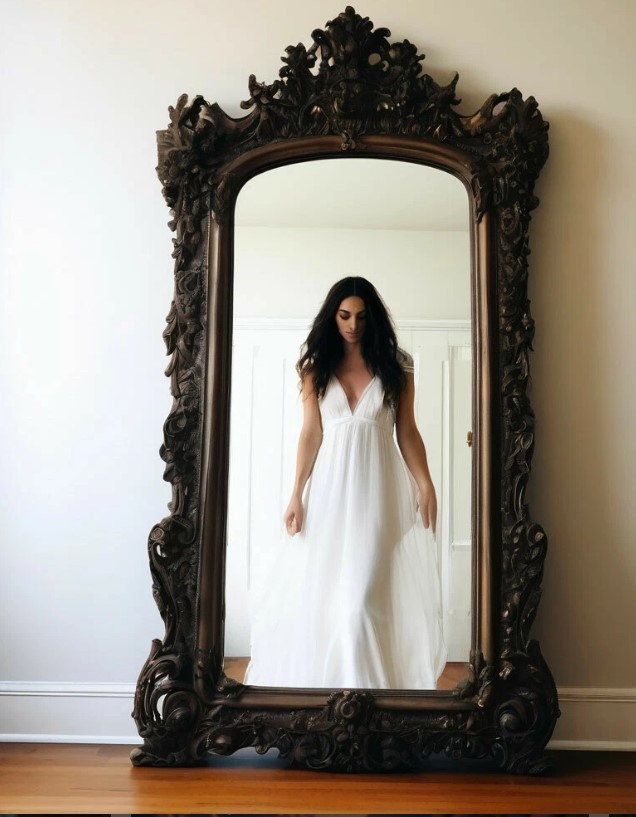 Неля стояла у стола в комнате и смотрела на завядшие цветы, висевшие на стенках вазы. Неля вошла в спальню и встала напротив зеркала.