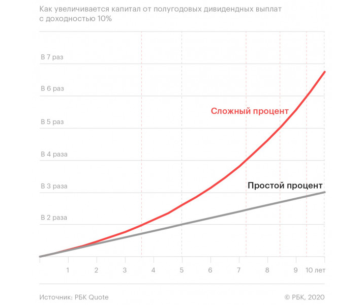 Предположим, вы инвестировали в компанию, которая стабильно выплачивает 10% дивидендов раз в полгода. Если вы будете реинвестировать эти дивиденды, то через 3,5 года ваш капитал удвоится. ⏳