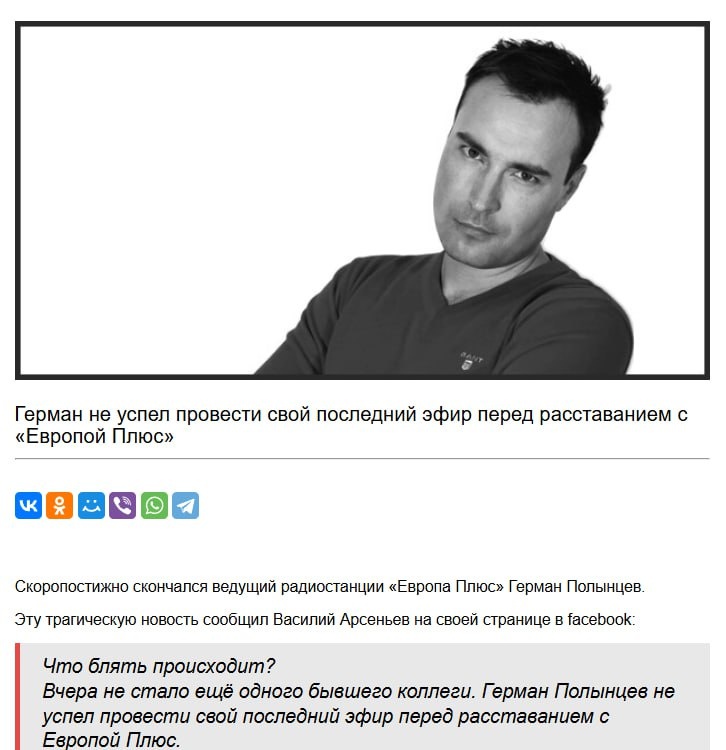 В контексте сложного расставания с любимой работой вспомнился случай из 2019, когда перед последним эфиром умер ведущий федеральной Европы Плюс Герман Полынцев. Вообще, история тяжёлая. Радио - это, с одной стороны тяжёлый наркотик. Немногие понимают схему его действия. Однажды поняв, что твоё предназначение - делиться с людьми своими мыслями, транслировать им своё настроение, мотивировать их, ты сталкиваешься с тем, что больше не сможешь это делать. А это для тебя не столько кайф, сколько непосредственно базовая необходимость, как у птицы - петь. Кто-то ломается, кто-то справляется, а кто-то не справляется. Вообще, не представляете, сколько у меня таких историй в жизни было))))) Отдельную книгу можно написать. Годы без эфира, которые удалось потратить на развитие множества полезных навыков. Уходить из эфира "навсегда" было тяжело только первый раз. Второй - не особо, третий - обидно, но на лайте... Конечно, во времена интернета, можно самостоятельно набрать и аудиторию гораздо бол