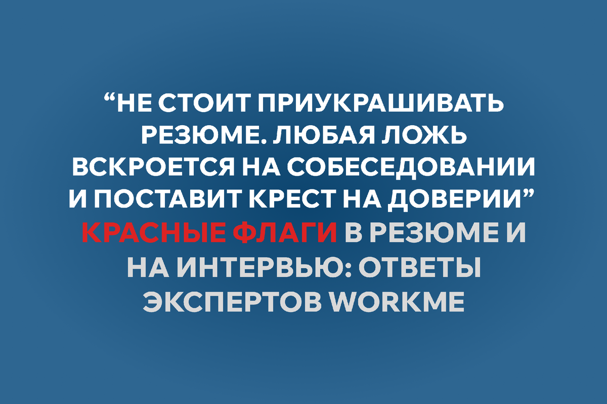 Главный вывод экспертов Workme: перестаньте приукрашивать резюме. Любая неправда вскроется и лишит вас доверия. Честность и готовность учиться ценятся намного выше.