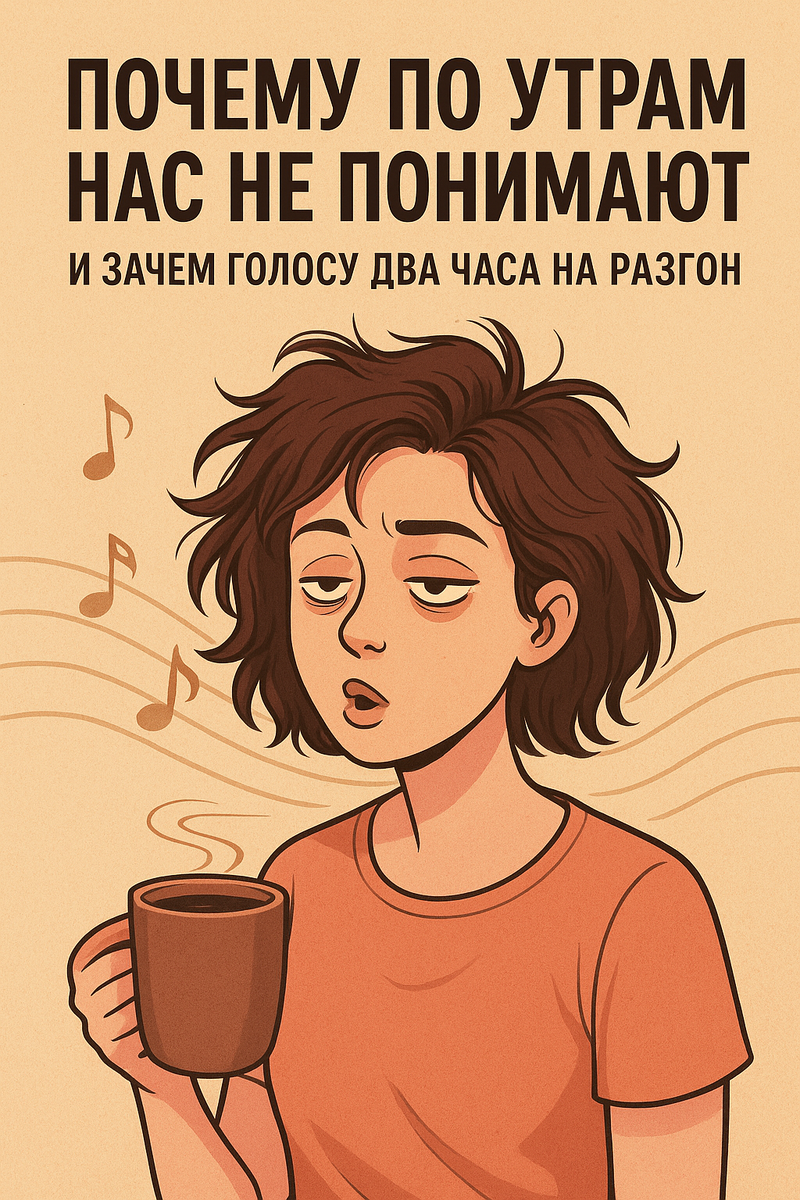 Вы когда-нибудь пытались сказать что-то близкому человеку сразу после пробуждения? Нет? Поздравляю — вы либо не живёте с людьми, либо говорите на одном языке со сном. А теперь представьте: ваш молодой человек утром смотрит на вас, как будто вы только что изобрели новый диалект: «Я не понимаю твой язык. Ты вообще на человеческом сейчас?» И да, вы понимаете его. Голос низкий, слова склеиваются, артикуляция будто в отпуске, а мозг думает исключительно о кофе. И вот тут начинается самое интересное. Почему так происходит и как с этим бороться, если вы хотите петь, а не мычать? Голос утром — это спящий инструмент Ваш голос — это мышцы, связки и мозг. Ночью они отдыхают. Связки пересохли и потеряли эластичность, звук выходит глухой. Мышцы артикуляции ленятся, язык и губы склеиваются. Мозг ещё не подключился к речевым зонам — он думает о кофе, завтракe и миллионе мелочей. Результат? «Доброе утро» звучит как смесь «мррр» и «ффф». Близкие не понимают вас — и это нормально. Два часа на разг