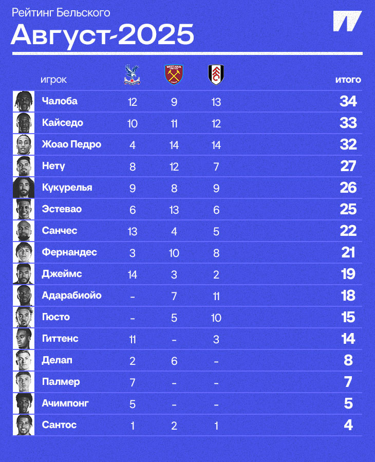 А вот на шестом месте расположился новичок – Эстевао с 25 баллами. Приятный сюрприз – вряд ли Мареска планировал столько игрового времени для бразильца в августе. Сыграла травма Коула Палмера, неубедительная игра Джейми Гиттенса и яркие камео Эстевао в товарищеских встречах. Бразилец уже отличился ассистом с «Вест Хэмом», став самым молодым игроком в истории «Челси» в АПЛ с голевой передачей. Верим, что продолжит в том же духе!