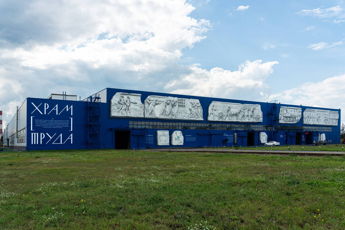 Не так давно гигантские масштабы выксунского производства уже вдохновили на создание масштабной фрески, в частности, аж самого Эрика Булатова, но новая настенная живопись уверенно шагает в область абсолютного, академического искусства, живущего вне времени. Работа площадью почти две с половиной тысячи квадратных метров называется «Храм труда» и эксплуатирует искусство эпохи эллинизма. Современные рабочие цеха облачены в древнегреческое (при русских штанах и сапогах, впрочем), их лица торжественны, позы академичны. При том что новая работа суть двухмерная, плоскостная, она искусно имитирует объемы барельефа. Монументальную работу создали екатеринбургские художники из команды Spektr под руководством команды Stenka. Прежде чем приступить к работе, художники постарались как можно глубже проникнуться материалом. Они ознакомились с производством, побеседовали с заводчанами и жителями Выксы. В итоге «Храм труда» сложился из пяти больших и пяти малых фресок. Большие фрески в верхней части стен