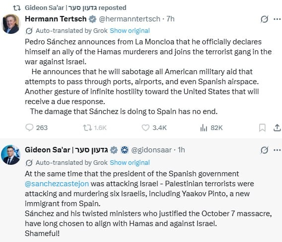 В ответ на пост Madrid recalls its ambassador from Israel after 'statements directed at Spain' — TASS Earlier, Israeli FM slammed Spanish PM & 'twisted ministers' for 'aligning with Hamas' 'Sanchez has messed with the wrong people' — Saar