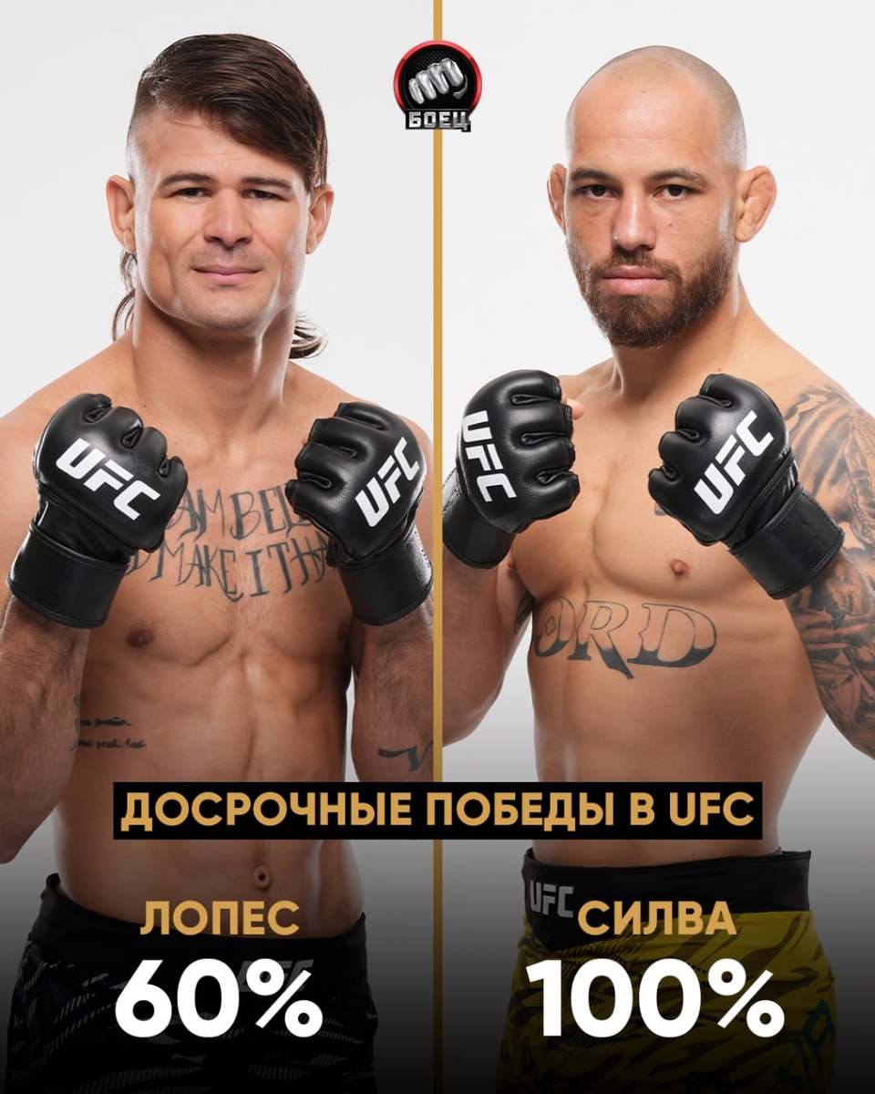 Теперь поговорим о главном событии предстоящего UFC Ноче ⚔️ У Лопеса и Силвы по пять побед в лиге. Но по финишам Жан обходит своего соперника – он побеждает только досрочно 👊🔥 Какие ожидания у вас от этой встречи?