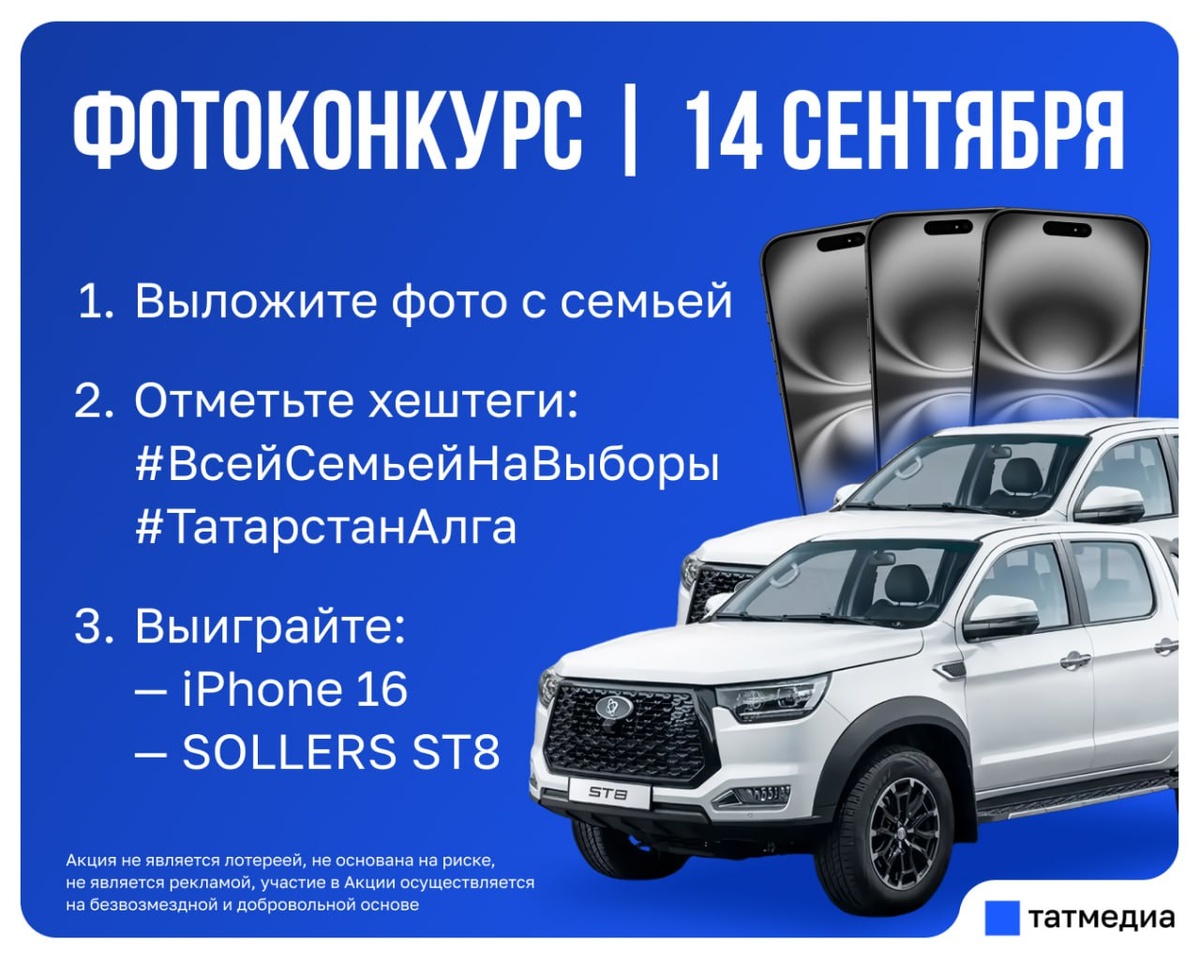 В ответ на пост 🗳🚙Два автомобиля Sollers ST8 и 11 смартфонов разыграют в РТ в единый день голосования Чтобы принять в конкурсе участие, следует: 🔹14 сентября с 7:00 до 20:00 сделать семейное фото на фоне избирательного участка РТ (снаружи) со специальным браслетом «Всей семьей на выборы», который можно получить рядом с избирательным участком после голосования; 🔹выложить фото на своей странице в социальной сети «ВКонтакте» с двумя обязательными хэштегами #ВсейСемьейНаВыборы и #ТатарстанАлга 14 сентября с 7:00 до 20:00. Обязательные условия: • Фото с семьей должно быть сделано на фоне избирательного участка – снаружи. На фотографии должен присутствовать узнаваемый элемент входной группы избирательного участка: надпись, плакат, баннер. • На фотографии должен быть виден минимум один специальный браслет, выдаваемый проголосовавшим на избирательных участках. • Хэштеги ВсейСемьейНаВыборы и #ТатарстанАлга должны быть в одном посте с фотографией (не в комментариях). • Участником фотоко