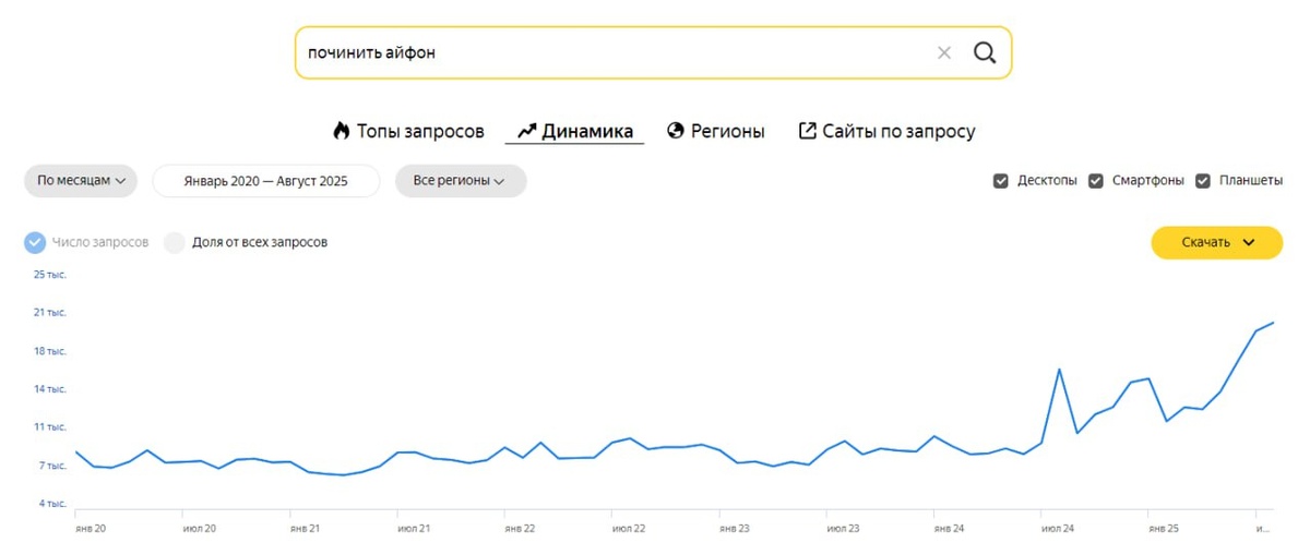 ПОЧИНИТЬ или КУПИТЬ НОВЫЙ Согласно данным Яндекса почти за год люди предпочли починить айфоны чем купить новый. Что это новый мегатренд? Такой вывод можно сделать если взглянуть на график, но при прочих равных спрос на айфоны остается стабильным. Однако нужно учитывать еще фактор окупаемости трафика, ставки высокие, банки сократили рассрочки. Возможно люди стали чинить. Аномальное явление, пообщаюсь с ребятами кто чинит.