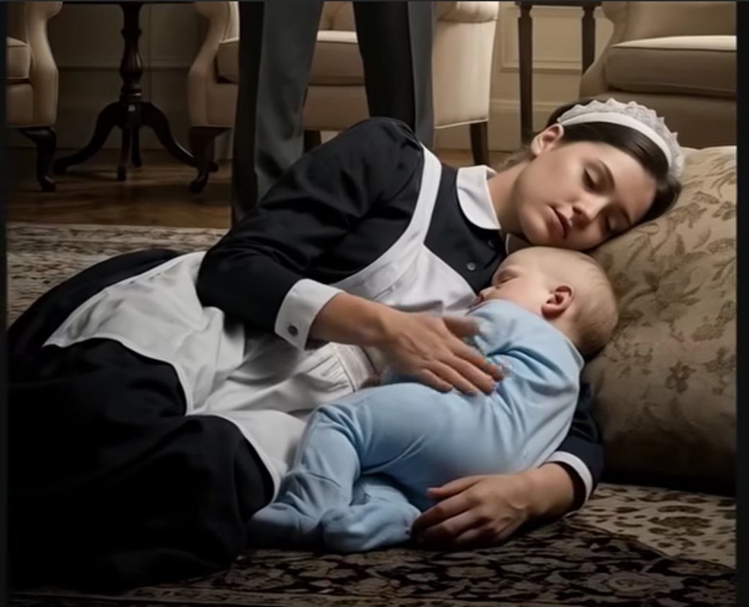 На полу, на тонком одеяле, лежала горничная Лина, молодая женщина с усталым лицом, крепко обнимающая спящего младенца — его сына, шестимесячного Мишу. Её тёмные волосы разметались по одеялу, а лицо, даже во сне, хранило тень тревоги. Рядом валялась пустая бутылочка для кормления. Кроватка младенца стояла нетронутой, а Лина, судя по всему, просто не успела или не посмела её использовать.