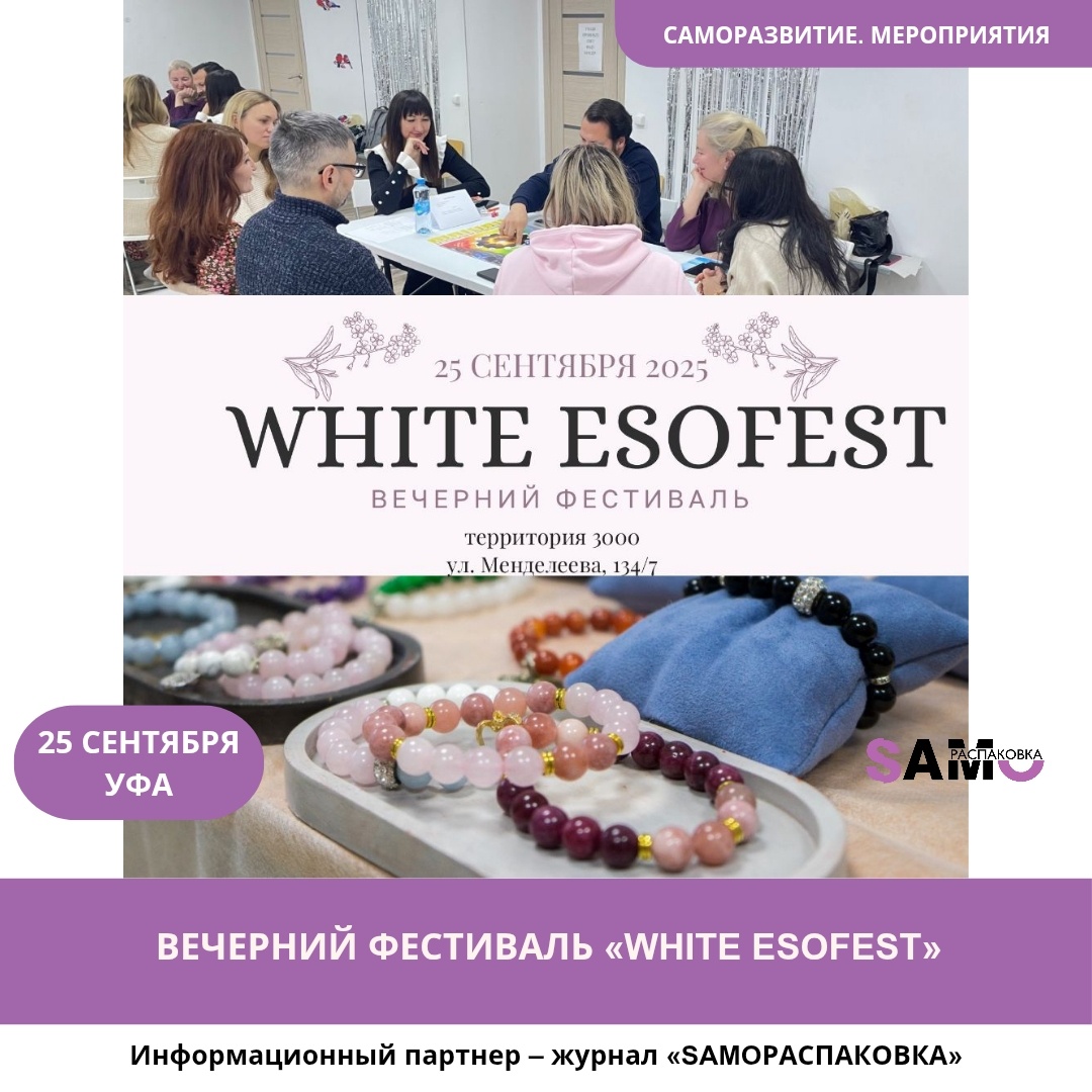 Журнал SAMОРАСПАКОВКА выступает информационным партнёром вечернего фестиваля «White EsoFest», который пройдёт 25 сентября в Малом зале «Арены 3000» (ул. Менделеева, 134/7) с 17:30 до 22:00. Этот формат задуман для тех, кто в будни хочет совместить атмосферу вечера с поиском новых идей и инструментов для самопознания. В программе — мини-консультации специалистов в области психологии и практик личного развития, а также маркет с авторскими находками и вкусными открытиями. Среди участников фестиваля — эксперты и практики, работающие в разных направлениях: Люция Тендитник, Азат Юсупов, Айгуль Юсупова, Юлианна Бабикова, Алмара Марукян, Юлия Дементова, Резида Сафина, Светлана Газизова, Сурия Бушмакина, Резида Салихова, Ирина Каримова, Карина Биглова, Сергей Матвеев. «White EsoFest» — это пространство для общения, новых встреч и вдохновения, где каждый может найти то, что откликнется именно ему. #о_журнале_СамоРаспаковка #Саморазвитие_СамоРаспаковка