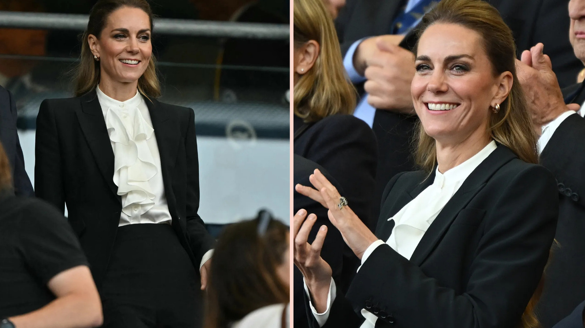 У принцессы Уэльской выдалась насыщенная неделя: в субботу она посетила женский Кубок мира по регби в Бирмингеме. Кейт Миддлтон, которая является патроном Футбольного союза регби, сияла, наблюдая за матчем Англия - Австралия на стадионе "Брайтон энд Хоув Альбион". Мать троих детей была воплощением элегантности, надев черный костюм от Alexander McQueen и шелковую блузку с каскадными оборками от Knatchbull. Решение Кэтрин надеть черное, по-видимому, было данью уважения герцогине Кентской, о смерти которой было объявлено в пятницу. Кейт дополнила образ миниатюрной классической сумочкой Chanel и уложила волосы в аккуратную прическу, продемонстрировав сережки Cartier 18K Pink Yellow White Gold Small Trinity Earrings. После матча Кэтрин посетила женскую сборную Англии по регби в раздевалке, чтобы лично поздравить их с победой со счетом 47:7. В социальных сетях принца и принцессы Уэльских появилось видео, на котором запечатлен этот момент, а также кадры, на которых принц Уильям наблюдает