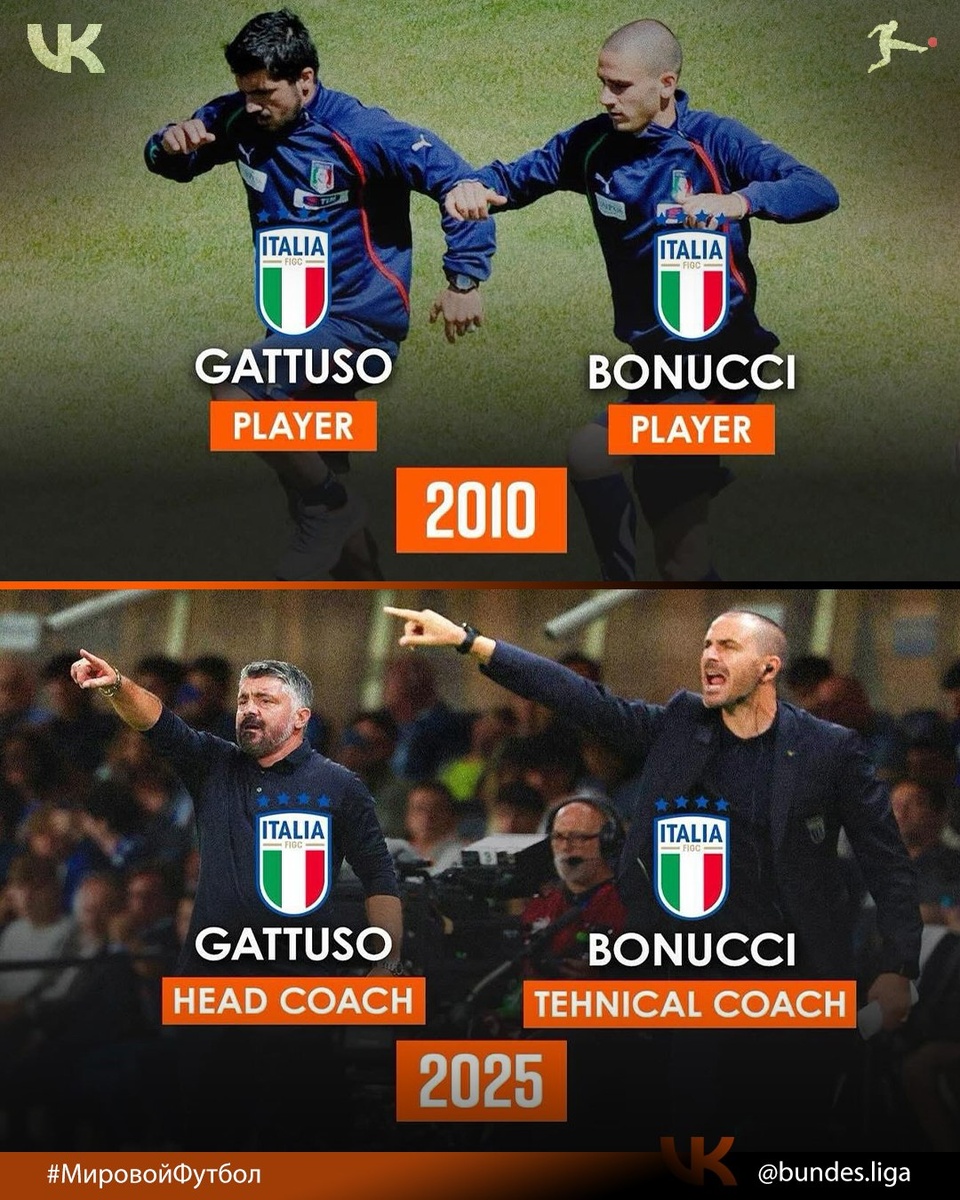 Дружба, Доверие, Партнёрство 👏 Одна цель! 2010: Дженнаро Гаттузо и Леонардо Бонуччи выступают за Италию. 2025: Дженнаро Гаттузо - главный тренер, а Леонардо Бонуччи - технический тренер Италии 🇮🇹 Италия пропустила два Чемпионата Мира подряд. Дважды подряд не сыграть на чемпионате мира – с Италией такое впервые 🤦♂ В самом разгаре третий отбор на ЧМ2026. Надо сказать, что и сейчас у итальянцев дела идут весьма скромно. Сборная идёт третьей в свой группе, где выше располагаются Израиль (2 место, матч Израиль - Италия сегодня 08.09.25) и Норвегия (1 место, 12 из 12 очков). Напрямую выходит только первой место группы. Второе - стыки ⚡