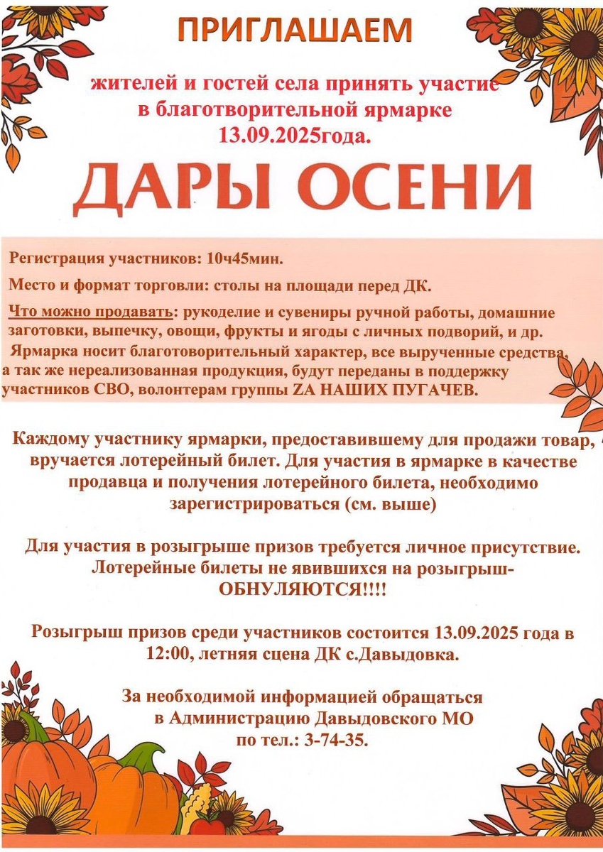 Приглашаем всех желающих принять участие в благотворительной ярмарке, которая пройдет 13 сентября 2025 года в 11:00 в селе Давыдовка (площадь перед ДК).