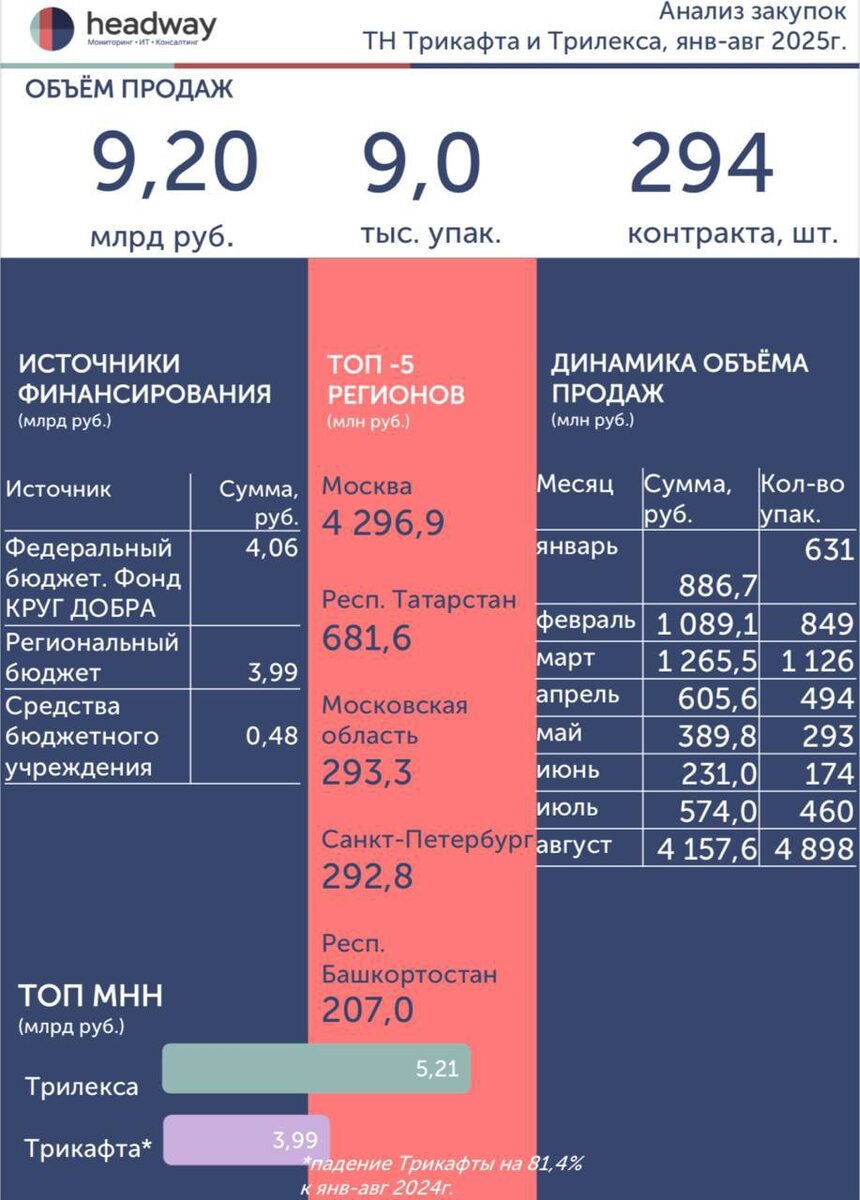 Сегодня во Всемирный день борьбы с муковисцидозом рассмотрим закупки двух ЛС для лечения этого заболевания - оригинальный ТН «Трикафта» (Америка) и дженерик ТН «Трилекса» (Аргентина) Первые торги с дженериком Трилекса состоялись: 🔴в ноябре 2024г. на сумму 10,8 млрд руб. (4 279 упак.) 🔴в декабре 2024г. на сумму 0,8 млрд руб. (935 упак.) Ситуация в 2024г. В янв-окт 2024г. лидером закупок являлось ТН Трикафта на сумму 22,91 млрд руб (как монополист), с ноября 2024г. к гос.закупкам присоединилась Трилекса с объёмом продаж 11,67 млрд. Итого объём рынка за весь 2024г составил 36,83 млрд руб. В янв-авг 2025г. у ТН Трикафты произошло падение ~ на 82% и ситуация изменилась в пользу более дешёвого аналога - Трилексы. 🔸Объём продаж - 9,20 млрд руб., из них: 🔴#Трилекса занимает долю 56,64% на сумму 5,21 млрд руб (5,97 тыс. упак.) 🔴#Трикафта на сумму 3,99 млрд руб (2,95 тыс. упак.) Самый большой объём закупок (в деньгах) состоялся в августе на сумму 4,1 млрд руб., 4,8 тыс упак. 🔸Основным за
