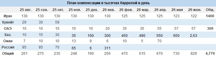 Основная часть компенсационных сокращений должна быть обеспечена Казахстаном, который стабильно добывает больше, чем планировалось. За ним следуют Ирак, Россия и ОАЭ.