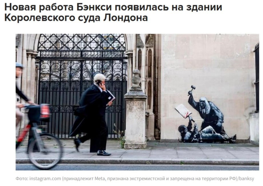 🔠🔠🔠🔠🔠🔠🔠🔠🔠🔠 👍 А у нас, товарищи, искусство! Хотелось бы сказать "их нравы", но нет, нет, это - и наши уже нравы.... 🤨 Новая работа Бэнкси появилась на здании Королевского суда Лондона. На ней судья бьёт молотком человека, пытающегося высказать своё мнение 🤨 Работа появилась через два дня после того, как в Лондоне на акции протеста против запрета на палестинскую акцию были арестованы почти 900 человек. 🤨 Ниже - ещё пара работ Бэнкси: маяк (он был уже на канале) и "Мадонна с младенцем". Открытый сосок, из которого течёт канализационная вода, прозрачно намекает.... Suum cuique Wars not make one great Democracy Dies in Darkness #Pro_Имперскую_культуру Рогов Илья 🇷🇺