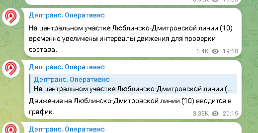 Привет. Вы на канале Хома - Хома про метро. В этой статье вы узнаете про сбой на ЛДЛ . Вечером, 8 августа в 19:58 на ЛДЛ задымился состав типа Номерной. Люди сообщают что их высадили на станции Чкаловская , и в вагоне пахнет гарью . На центральном участке Люблинско-Дмитровской линии (10) временно увеличены интервалы движения для проверки состава. Потом на станции пошёл дымок. Когда начался дым, то поезд очень быстро поехал в тупик за станцией . Пассажирам пришлось ждать следующего поезда. Движение на Люблинско-Дмитровской линии (10) вводится в график. Движение по линии в графике . Движение на Люблинско-Дмитровской линии (10) в графике. Причина сбоя оказалось не исправность состава. Чтоб таких аварий избежать на ЛДЛ на запустить новые поезда , но Дептранс предпочитает заменять старые поезда на зелёной ( и это вообще хорошо ), но до салатовой линии дело не доходит уже какой год. Но зато на этой линии будут позже ходить новые загадочные поезда с автопилотом. На этом всё . Статья завершин
