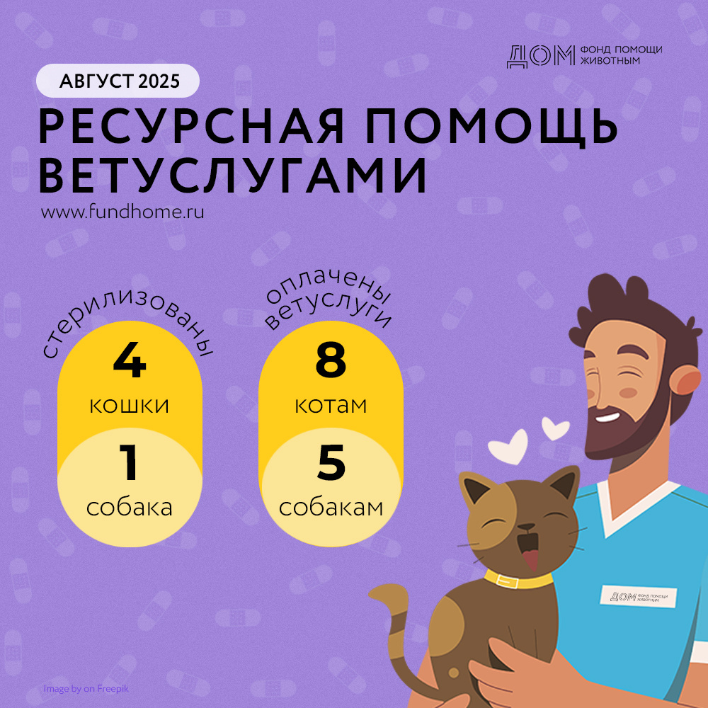 В августе в рамках программы «Ресурсная помощь кураторам животных ветеринарными услугами» фонд «ДОМ» помог с лечением и стерилизацией нескольким хвостикам: - кошкам Косухе и Мухе - кошкам Нефертити и Хикат - коту Рыжику - кошке Фуфырке - псу Брейву - собаке Кэрри - 8-ми котикам и 6-ти собачкам, живущим у неравнодушного волонтера Всего на помощь этим замечательным хвостикам были направлены 115 333 рубля. Рассказываем подробнее: 🐱🐱Кошечки Косуха и Муха жительницы одного из московских двориков, в котором мы уже больше года помогаем стерилизовать кошечек. 🐱🐱Нефертити и Хикат прошли процедуру стерилизации, они тоже дворовые кошечки, только это уже другой двор 😁 🐱Котик Рыжик борется с серьезным заболеванием ФИП. Половину курса препарата он уже прошел, осталось столько же, мы помогаем в его закупке. 🐱Кошечке Фуфырке с влк мы оплатили обработку ушек и терапию от кальцевироза. 🐶Собачке Кэрри мы помогли с оплатой антибиотиков и ингаляций для лечения воспаления легких. 🐶🐶🐱🐱🐱8 к