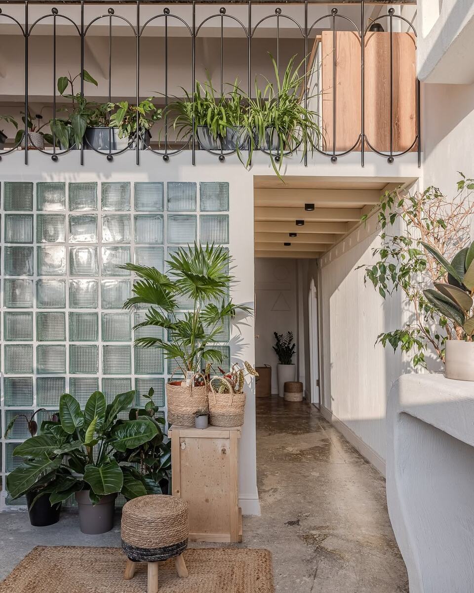 Высокие потолки (в самой высокой точке — 4,6 метра) вдохновили нас на создание двухъярусного «островка», который помог рационально организовать вспомогательные зоны, не перегружая интерьер. На первом этаже островка расположились: ✔️Раздевалка с душевой ✔️Компактный санузел На втором этаже расположились небольшая кухонная зона и место для бесед за чашечкой чая после занятий. Даже при ограниченной площади мы добились ощущения простора. Это стало возможным благодаря: - Стене из стеклоблоков, которая впускает в раздевалку много естественного света; - Открытой конструкции потолка. Не стали скрадывать высоту обшивкой. Плюс работали с рисунком каркаса, чтобы добавить визуально объема. - Ну, и конечно, светлой палитре