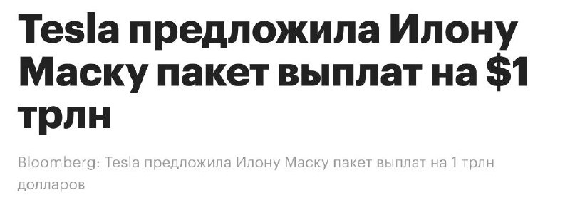 Илон Маск может стать первым триллионером. Tesla предложила основателю новый компенсационный пакет. Как сообщает Bloomberg, его стоимость оценивается в $1 трлн. Таким образом, компания хочет стимулировать Маска к управлению. Чтобы получить эту сумму, Илону Маску придётся увеличить рыночную капитализацию Tesla с нынешних $1,09 трлн до $8,5 трлн за 10 лет. Серьёзный вызов. @lobushkin