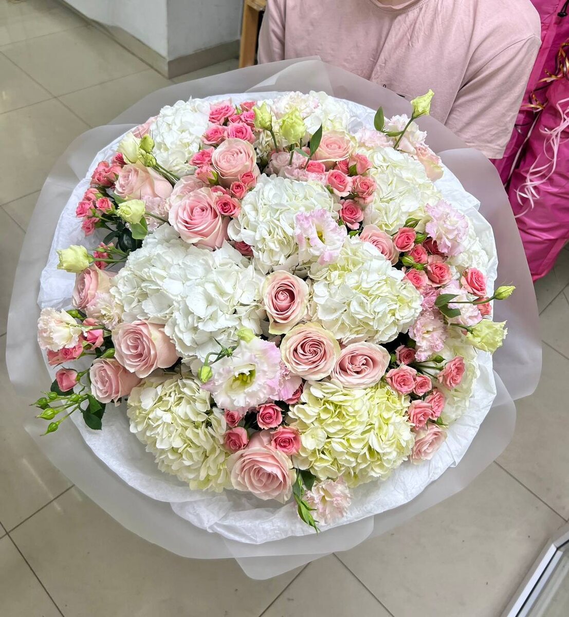 Букет, собранный с любовью, объемный и нежный, воздушные гортензии в сочетании с розами и эустомой