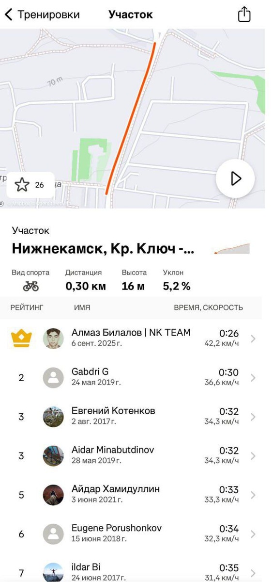 Царь горы - Красный ключ Каждый житель Нижнекамска знает этот подъём на красном ключе. Большинство велосипедистов идёт в него пешком, а заехать туда на велосипеде считается достижением среди велосипедистов выходного дня. Заезжать на велосипеде в этот подъём я начал относительно давно, однако нынешних результатов я добился совсем недавно. Любители спортсмены пользуется спортивным приложением STRAVA и в нём записывают свои занятия спортом, лайкают заезды и забеги других участников, комментируют их, а также соревнуются в сегментах. Кто-то случайно попадает в топ, а кто-то пытается стать первым, а именно царём горы целенаправленно. И этот сегмент про второй случай. Пост про хвастовство, в первую очередь, ведь в 2023 году я уже был на первом месте и считал, что перебить данный рекорд невозможно, однако всё же я ошибался. В далёком 2019 году, когда сегменты для меня были чем-то актуальным, я пытался взять ЦГ на этом сегменте, однако сразу стало понятно, что даже ТОП-10 мне не видать. По