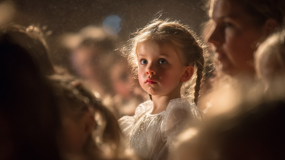 Зазвучала музыка. Снежинки начали кружиться по сцене. Алиса сначала робко переступала с ноги на ногу, оглядываясь на других детей. Но постепенно музыка захватила её, движения стали более уверенными, а на лице появилась улыбка.