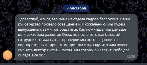 Таролог решила, что знак зодиака важнее навыков, и уволила сотрудницу. HR в лоб написала: «Вы нам не подходите, компания меняет вектор и теперь должна встать Раком». Так что ночью всех скорпионов массово отпишут от канала — просьба отнестись с пониманием 🌌 Подробнее: https://hard-tm.su/threads/113116/ 🕹HARD-TM — Подписаться