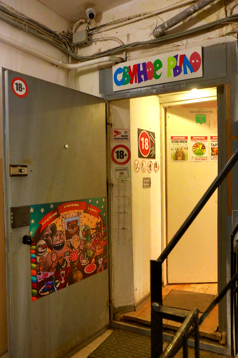 В сентябре 2025 года занесло нас с женой в творческую мастерскую "Свиное рыло", что находится на 5 этаже жилого дома, рядом с цирком на Фонтанке. Немного истории: данное пространство организовали в 2016 году питерские "Колдовские ходожники" или если кратко КОЛХуИ (КОЛдовские ХУдожникИ) в состав которых входили порядка 20 адептов кисти и мольберта, из которых я лично, слышал только про Копейкина, работы которого периодически мелькают на просторах интернета. Данная команда возникла в начале 21 века из, так называемого, Неформального Объединения Молодежи (НОМ). Артемий Троицкий так охарактеризовал Колхуизм: "Правильное русское искусство всегда принадлежало народу и исходило из его недр. Неправильное русское искусство всегда принадлежало элите и исходило из догм Возрождения и Просвещения. Эти две генеральные линии сошлись в одной точке под названием Черный Квадрат Малевича и затем разошлись уже навеки. Одна загнулась налево и дошла до, например, Концептуализма; другая пошла вправо и увенч
