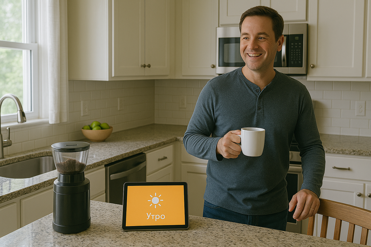 — «Я хочу, чтобы кофемолка запускалась автоматически утром. Не кофемашина, а именно кофемолка. Чтобы звук свежемолотого кофе будил меня лучше любого будильника». Мы подключили её через умную розетку и встроили в сценарий «Утро». Теперь в 7:00 кофемолка начинала работать, а в кухне включалась мягкая подсветка. Итог: хозяин был в восторге. Он говорил: