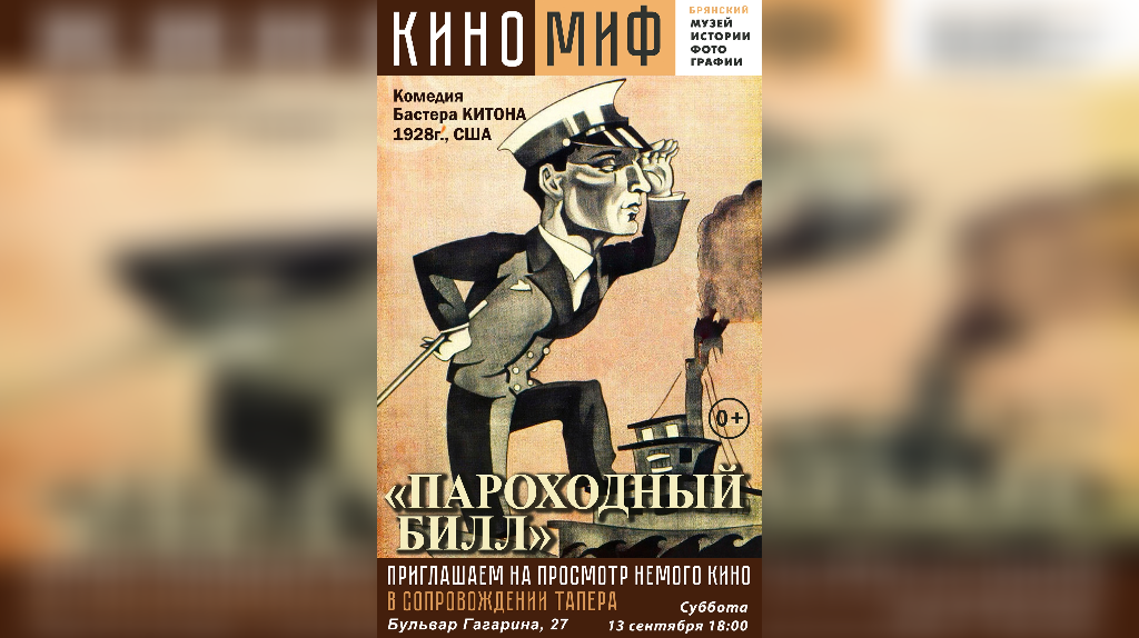 В субботу, 13 сентября, в 18:00 в рамках проекта «КиноМиф» зрителей приглашают на показ немой кинокомедии 1928 года с Бастером Китоном в главной роли. Фильм «Пароходный Билл» переносит в атмосферу Миссисипи времён колесных пароходов и рассказывает о молодом человеке из Бостона, которого строгий отец пытается приучить к работе на реке. Лента вошла в знаменитую подборку «1001 фильм, который стоит увидеть хотя бы раз в жизни». После просмотра гостей ждёт обсуждение картины и обмен впечатлениями. Записаться можно по телефону 8 (906) 504-88-88, а также через сообщения в группе или в комментариях к анонсу. 0+ В Брянске покажут немое кино с аккомпанементом тапера
