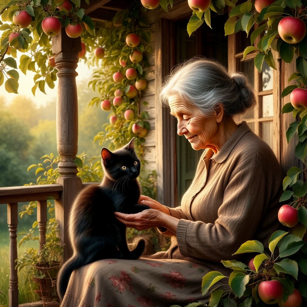 Старая яблоня, хоть и погнулась под бременем лет, все еще тянула свои ветви к солнцу, усыпанная румяными плодами. Сад вокруг домика был диким, но полным жизни – пчелы жужжали над цветами, птицы щебетали в листве. На крыльце, словно неотъемлемая часть пейзажа, сидела Анна.