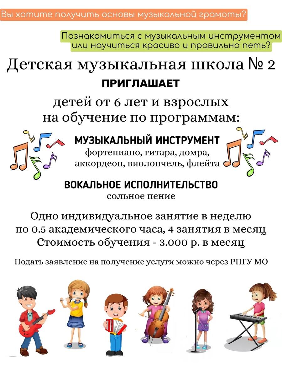 МУДО «Воскресенская Детская Школа Искусств» СП «Детская музыкальная школа Nº 2» 🎼 ПРИГЛАШАЕТ 🎶 детей от 6 лет и взрослых на обучение по программам: МУЗЫКАЛЬНЫЙ ИНСТРУМЕНТ (фортепиано, гитара, домра, аккордеон, виолончель, флейта) ВОКАЛЬНОЕ ИСПОЛНИТЕЛЬСТВО (сольное пение) Одно индивидуальное занятие в неделю по 0,5 академического часа, 4 занятия в месяц Стоимость обучения - 3.000 р. в месяц Возможен вариант: два индивидуальный занятия в неделю (0,5+0,5) Стоимость обучения - 6.000 р. в месяц Подать заявление на обучение ТОЛЬКО через ПОРТАЛ МОСРЕГ uslugi.mosreg.ru/services/2... ⁉️ Вопросы можно задать: 🔹 по тел. 8 (496) 445-19-01 #НашеПодмосковье #КультураПодмосковья #КультураВМР #КультМО #дшиподмосковья #ДМШ2 #ВоскресенскийГО #Белоозерский #muzshkola2
