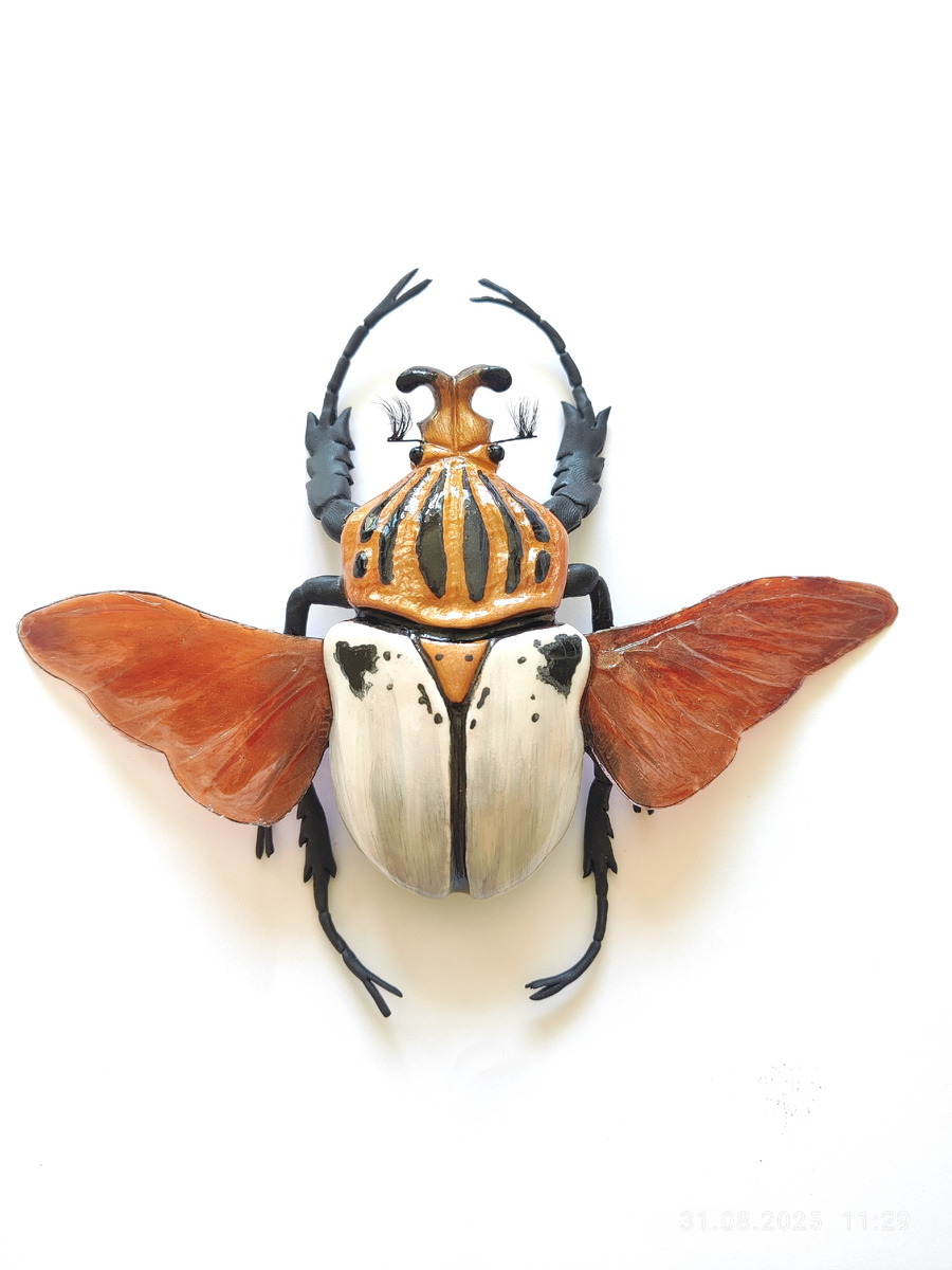 Хочу поделиться потрясающе красивым жуком - голиафом. Вообще, у меня в ассортименте очень много жуков голиафов всевозможных расцветок, есть даже изумрудный 😁 Это Goliathus Cacicus - жучок охристо-жёлтого цвета с продольными чёрными полосами. Надкрылья бело-серые с лёгким перламутровым отливом. Верхние углы надкрыльев с большими треугольной формы пятнами чёрного цвета. На голове есть Y-образный отросток. Удивительно, что такой эффектной внешностью может похвастаться самец, но не самка, которая вполне себе обычная и даже невзрачная. Ну что, попробуем повторить жучка, вдохновившись удивительной природой 😍 Ну красавчик же?!