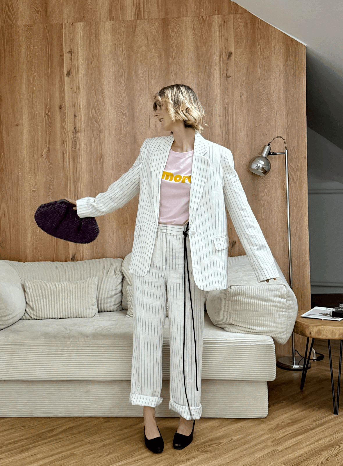 Вдохновлялась европейской эстетикой: деликатное сочетание цветов, разные фактуры, простые фасоны. Стилизация костюма Белый костюм в тонкую полоску давно был в моем списке желаний. Освежает портретную зону и сочетается с любыми цветами. Работает и в минимализме, и в многослойности. Можно носить его в офис без строгого дресс-кода или стилизовать в женственном casual chic. С розовой футболкой и мюлями – расслабленный Friday office. С жилетом и лодочками – образ на деловую встречу. С майкой и босоножками – универсальная летне-осенняя база. Сейчас такой хендмейд подворот модный стайлинг-прием, чтобы создать легкую небрежность и расслабленность образа. Нравится, как приоткрываются щиколотки – в сочетании с микро-каблучком – выглядит очень chic. Стилизация шорт Про себя назвала этот образ конфетным. Очень правильный и свежий оттенок розового. А он, говоря по секрету, будет самым актуальным цветом следующим летом. Но носить нужно уже сейчас, подчеркивая мягкий летний загар (у меня его пр