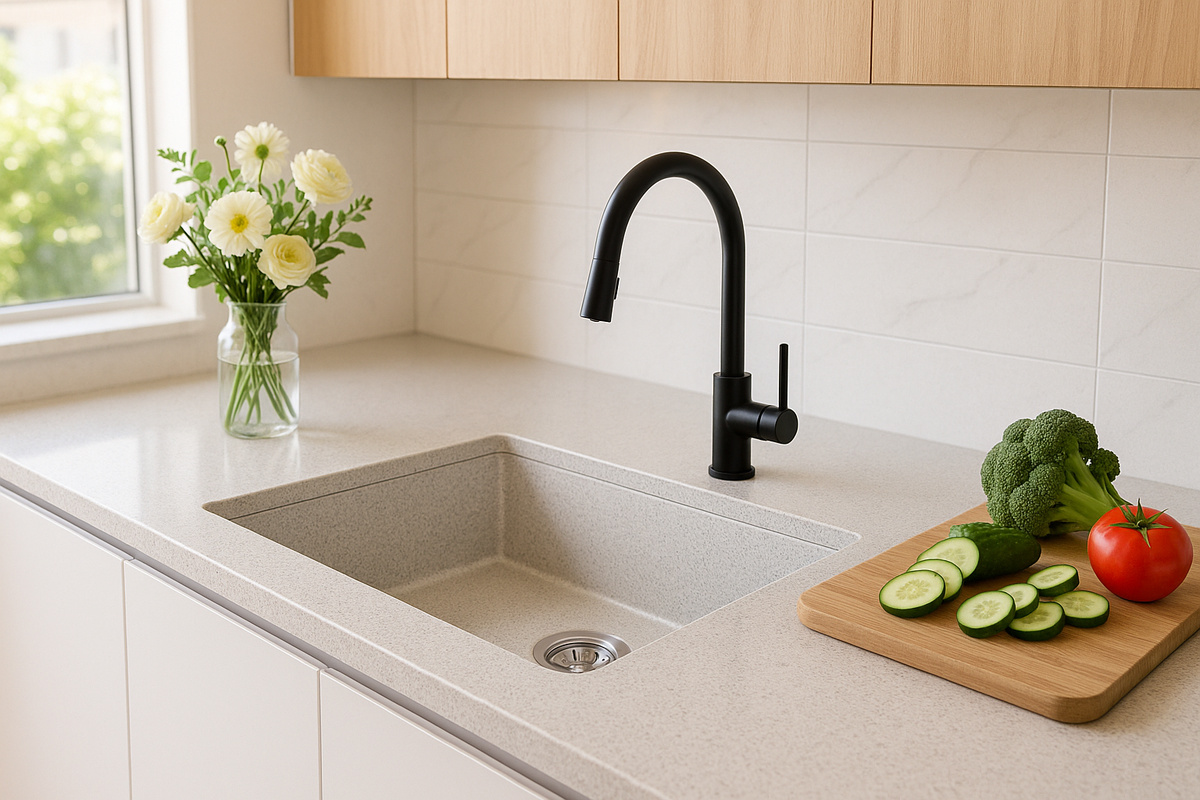 Кварцевые мойки изготавливаются из смеси кварцевой крошки (примерно 80–95%), полимерных смол (5–20%) и красящих пигментов. Этот состав обеспечивает высокую прочность, устойчивость к внешним воздействиям и разнообразие дизайна. В отличие от натурального камня, кварцевый материал позволяет создавать кухонные мойки любых форм, размеров и оттенков, что делает их универсальным решением для кухонь разных стилей — от минимализма до классики.