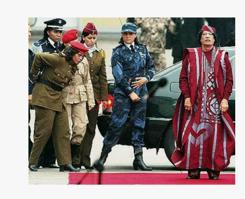 Плюс, девичья гвардия наглядно демонстрировала революционное равенство женщин в Ливии перед мужчинами. Ибо нигде более в арабском мире дамы не служат в спецслужбах и не держат в руках оружие. Еще одна тонкость - дамы служили своему шефу еще и передвижным гаремом, что он спокойно даже за границу возить без вопросов. Охранницы мои и все тут! Ну сами понимаете, чай не маленькие.