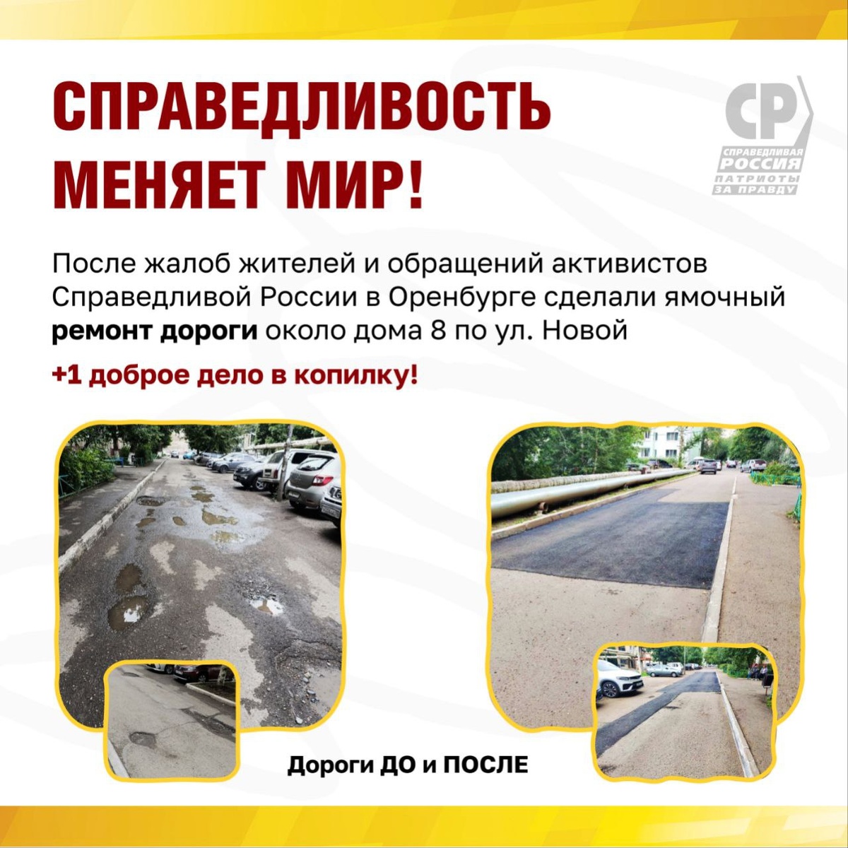 💪 Справедливость меняет мир! В Оренбурге сделали ямочный ремонт во дворе дома 8 по улице Новой Работу выполнили после жалоб оренбуржцев и обращений активистов Справедливой России. По словам жителей, долгое время дорогу не ремонтировали, а прошлый ремонт был выполнен некачественно: асфальт быстро расползся, дорога покрылась выбоинами. После дождя — «лотерея» — что попадётся в очередной луже? Вместе с жителями справедливоросы подготовили серию запросов и обратились в администрацию города. На днях дорогу около дома 8 по улице Новой частично отремонтировали. Работаем!
