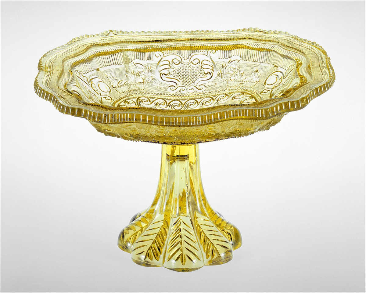 Разработка пресс-форм для стекла стала одним из самых важных нововведений в технологии производства стекла с момента изобретения выдувной трубки. В Америке к середине 1982 года такие декоративные формы позволяли ремесленникам создавать форму и орнамент сосуда практически одним движением. Хотя самые ранние украшения, как правило, были геометрическими, в прессованном стекле 1830х годов часто использовались сложные узоры с точечным фоном, что создавало эффект кружева. Это блюдо является одним из самых элегантных образцов кружевного прессованного стекла. Волнистый бортик украшен фестончатой лентой, создающей эффект мерцания. На чаше изображены завитки и другие элементы классики и рококо. Прессованное стекло производилось во многих различных стеклозаводах в начале девятнадцатого века. Этот Compote приписывается компании Boston and Sandwich Glass Company, одной из самых успешных и долгоживущих фабрик страны. Такое блюдо изготавливалось путем раздельного прессования чаши и основания. Дв