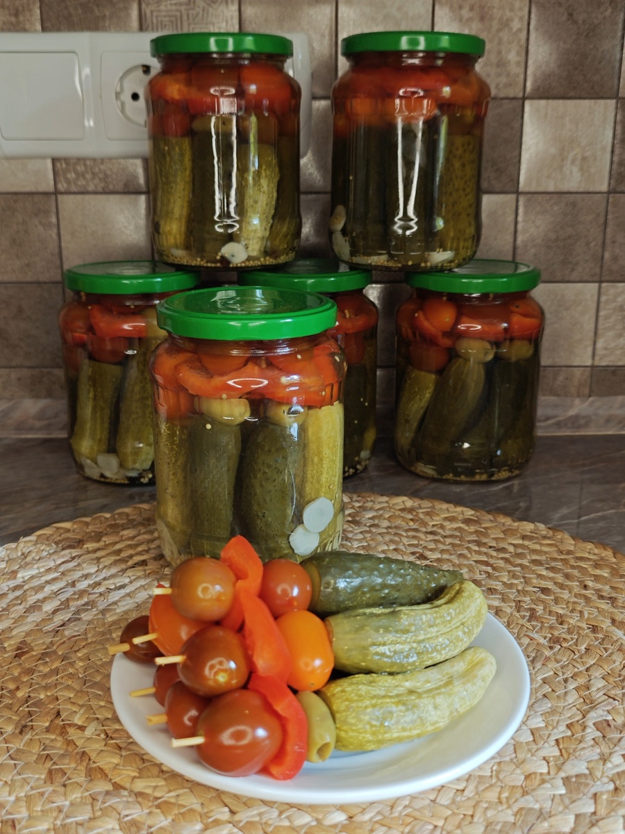 Ингредиенты на банку 750 мл: Лавровый лист — 1 шт. Чёрный перец горошком — 10 шт. Горчица в зёрнах — ½ ч.л. Чеснок — 1 зубчик (нарезать тонкими слайсами) Для рассола (на 1,5 л воды): Вода — 1,5 л Соль — 2 ст.л. Сахар — 2 ст.л. Уксус 9% — 50 мл Для шпажек: Огурчики (срезать кончики) Помидоры черри Сладкий перец (квадратиками, по размеру огурчиков) Оливки Лук-шалот или колечко кабачка (по желанию) Бамбуковые шпажки (не лакированные) Приготовление: 1. Подготовьте овощи: Огурчики подрежьте с двух концов. Перец нарежьте квадратиками Чеснок — тонкими пластинками. 2. На шпажки нанизывайте поочерёдно: черри, кусочек перца, оливку, завершите огурчиком. Можно так же использовать колечко кабачка, лук-шалот. 3. В каждую банку (750 мл) положите лавровый лист, перец горошком, горчицу и чеснок. 4. Аккуратно уложите шпажки в банки. У меня помещается примерно 7 штук в банку. 5. Залейте банки крутым кипятком, прикройте крышками и прогрейте: 750 мл — 10 мин, 1 л — 15 мин, 1,5 л — 20 мин. 6. Слейте