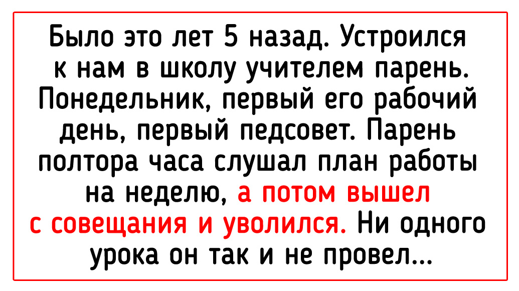 - Было это лет 5 назад. Устроился к нам в школу учителем парень. Понедельник, первый его рабочий день, первый педсовет. Парень полтора часа слушал план работы на неделю, а потом вышел с совещания и уволился. Ни одного урока он так и не провел. © uchakucha