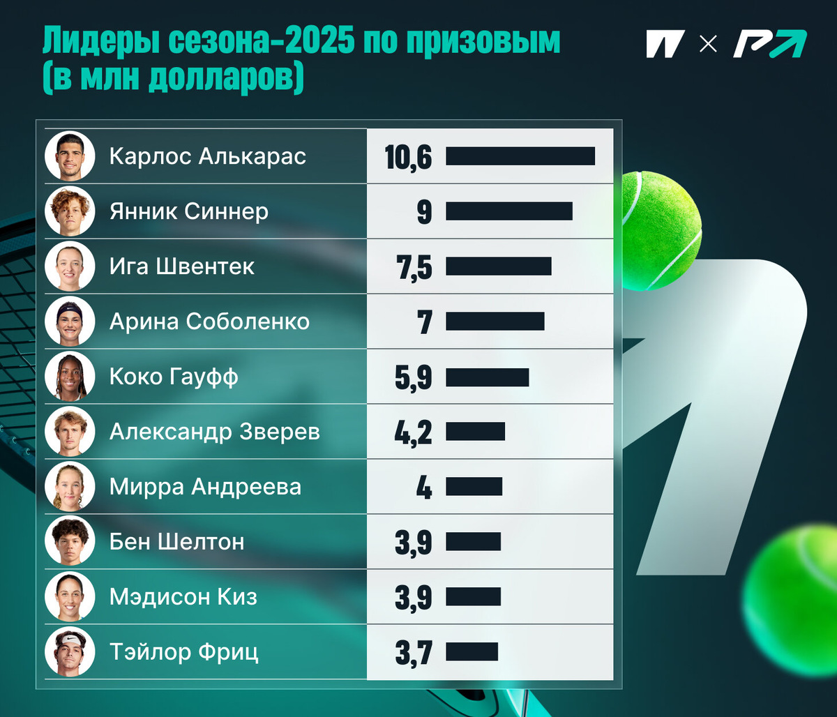 А на сайте Sportico собрали интересные цифры, демонстрирующие заработки элиты – это суммарные призовые топ-10 рейтинга за сезон.